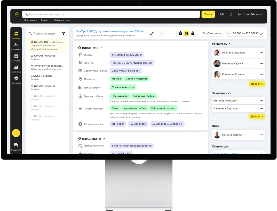 - Побочные блоки: Рекрутеры, Заказчики, BDM, Стоп-листы, Схема направлений, История изменений