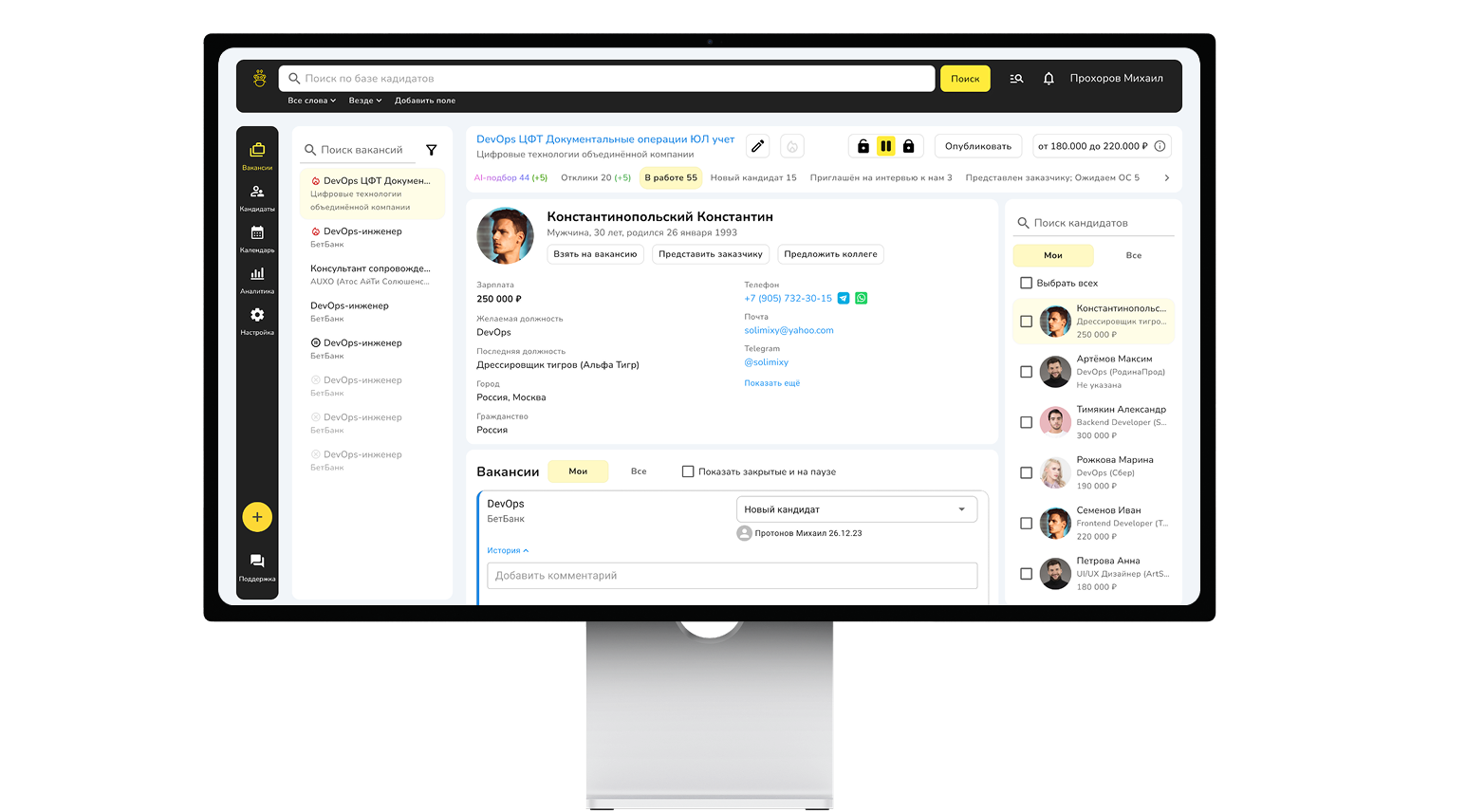 • карточка кандидата с контактами и основными действиями;